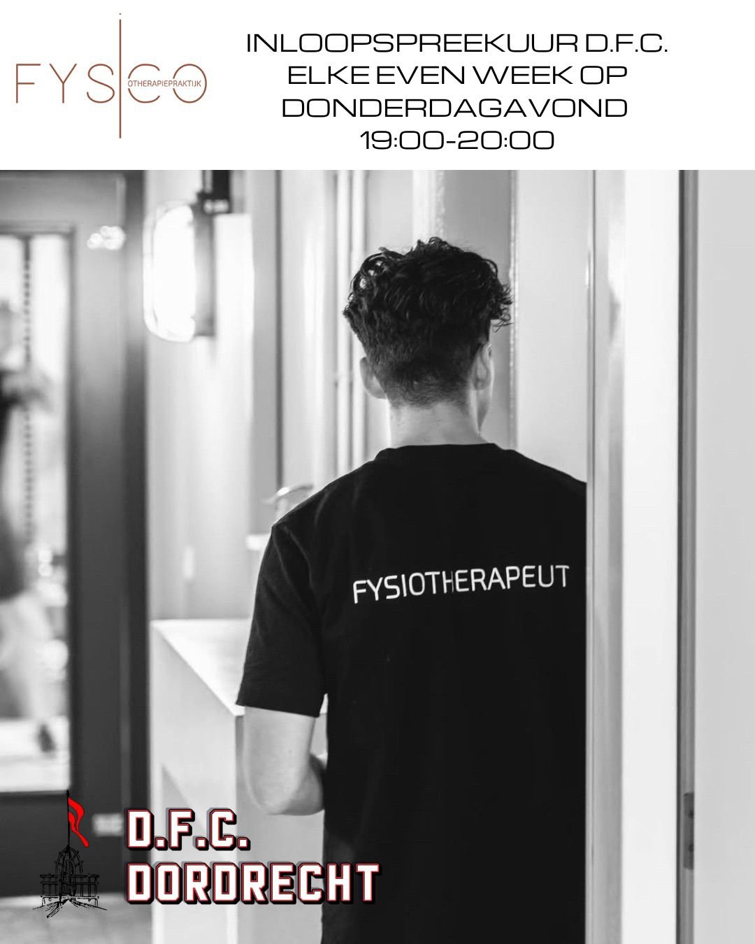 Kom dan langs bij het inloopspreekuur op D.F.C.De fysiotherapeut is elke even week op donderdag van 19.00 tot 20.00 uur in de verzorgingsruimte van D.F.C. te vinden.